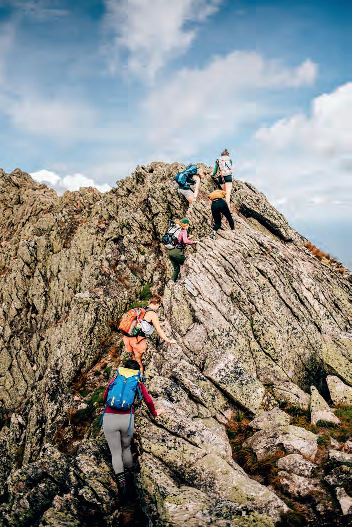 Today, Cutler Coast Public Reserved Land encompasses over 12,000 acres, and its trail network is laid out like a figure eight: The full loop covers almost 10 miles, while the shorter version is about half that. If you’ve got the stamina, the longer one is a worthy goal. For roughly three and a half miles you follow the coast—soaring above the water in places, finding your footing along the bony beachscape in others. Stopping points abound, from the clusters of pink sea roses, lupines, and other wildflowers do ing the land, to the pathways that lead visitors to the edge of the earth. Below, waves crash onto the shore; to the right and the le , slabs of giant rock rise hundreds of feet.