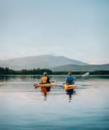 the New England Outdoor Center in Millinocket, Maine, kayakers head out onto Millinocket Lake, with Mount Katahdin rising in the distance. Photographed by Cait Bourgault. (To see more of