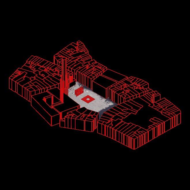 sectional isometric from the smaller courtyard, the offices and the academy of music building