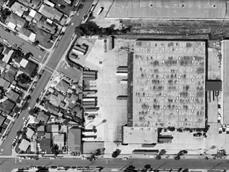 The 99 Cent Only Distribution Center was located in a 882,000 square-foot warehouse, built in 1947.. The building features numerous loading docks on three sides, while the fourth side is adjacent to another building. Additionally, there are 2 ramps and 3 stairs for workers to access the roof. Constructed from concrete, the building features metal corrugated siding. There are no windows or skylights, so any natural light will enter through the loading dock openings.