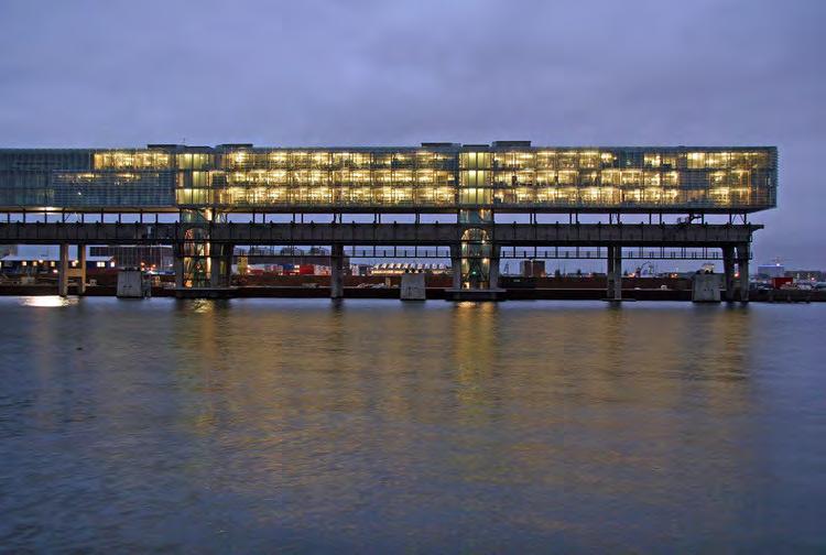 Built in 2019, the building is distinctive for its flat appearance on all sides except one, which features a sawtooth pattern along the whole wall. This side is functional providing an angled entry for trucks accessing loading docks. Additionally, one side of the building is angled to respond to the adjacent road and freeway, The exterior facade is primarily white, with the exception of the corner facing the street, where the main entry and lobby are located. The building has numerous windows and skylights to allow natural light to enter the building.