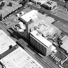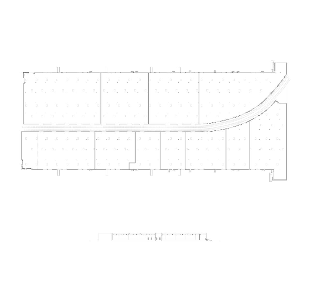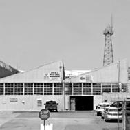 Built in 1946, the building has a unique form that curves on one side, responding to the adjacent railroad. Windows only appear on the side of the building that faces the street, while natural light enters through the commercial skylights. The building features a gray corrugated metal siding and concrete, contributing to its industrial aesthetic.