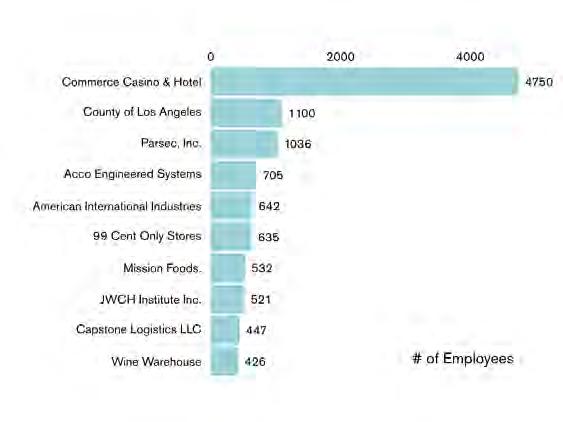 The city’s top employer is Commerce Casino & Hotel, with 4,750 employees, while the second top employer is a dramatic decrease with 1,100 employees. The 10th spot declines much more, with only 426 employees.