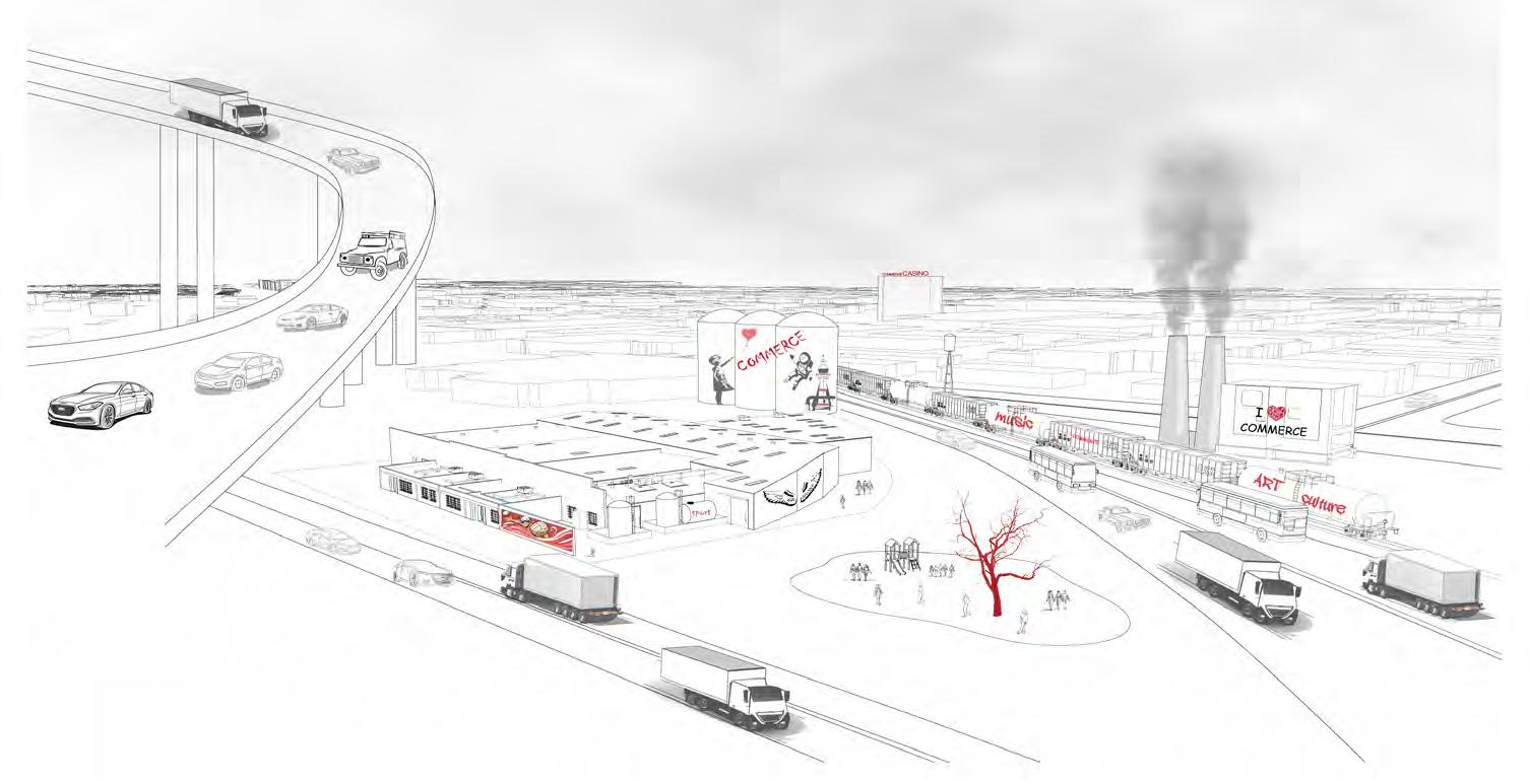 Infrastructure and Commerce is a culmination of the collective research conducted by our Fall 2024 studio on the City of Commerce, California. Over the course of our work, we delved into the city’s rich history, diverse culture, economic landscape, and more. Our intention was to treat this research as a shared body of knowledge that would inform the individual studio projects that grew out of this exploration.