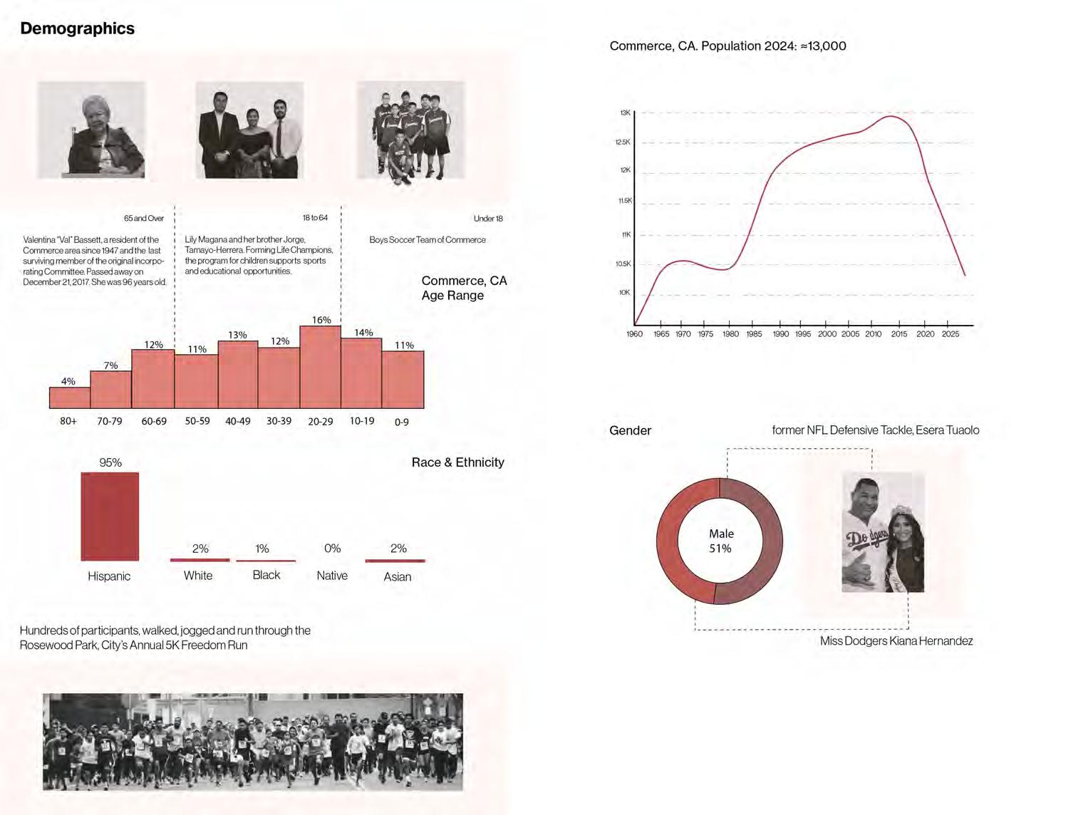 The City of Commerce, California, has a strong sense of community, with a unique blend of industrial development and residential neighborhoods. With a population of about 12,000 to 13,000 residents. Around 95% of the population identifies as Hispanic or Latino, with a median age of approximately 35 years. The city’s residents are primarily bilingual, with Spanish being a dominant language. Commerce balances its role as an industrial hub with a strong sense of community in its residential areas. The city offers extensive community services such as free transportation, educational programs, and recreational activities through local parks and community centers. Programs for youth and seniors are well-supported, reflecting the city’s commitment to family-oriented engagement. Despite its industrial nature, Commerce remains a close-knit, family-focused community. The culture of Commerce emphasizes family, community ties, and mutual support. Many events and programs are geared towarfamilies, with a focus on strengthening relationships between generations. The city’s various recreational programs and family activities highlight the importance of community connection.