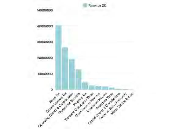The city gains most of it’s revenue from sales tax, which provides them $40,590,324, and it received the second most highest revenue from the casino license tax, which was $26,653,916 in revenue. It’s bottom source of revenue is from the “Motor Vehicle In-Lieu” category, with a $14,814 revenue. In total, the city received $113,447,208 in revenue in the year 2022 and had expenses totaling $74,461,786.