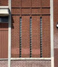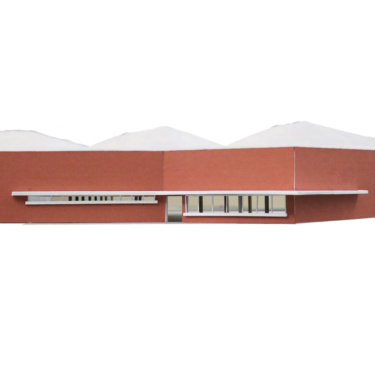 The building built in 1953, has a unique five-sided form, narrow at one end and widening at the other. The east face features a curve that complements the adjacent building’s curved design. On the south side, the structure is next to a segment of an old, inoperable railroad. The front of the building, where the main entrance is located, features many windows and faces towards a neighborhood. The building’s facade is made up entirely of red brick on three sides, while the fourth side is white accented with a strip of red bricks.