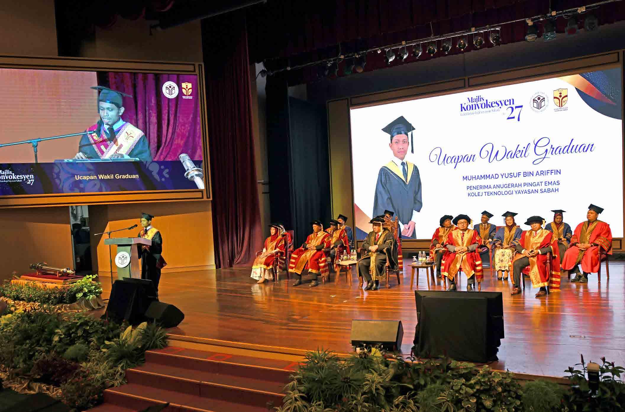 Ilmu dan kemahiran yang diperoleh di sini ialah bekalan penting dalam menghadapi dunia kerjaya serta memberi sumbangan kepada masyarakat dan negeri Sabah. Demikian menurut Pengarah Yayasan Sabah, Dato’ Sri Haji Gulamhaidar bin Khan Bahadar, dalam ucapannya semasa menyempurnakan Majlis Konvokesyen Kolej Teknologi Yayasan Sabah (KTYS) ke-27 pada 29 Oktober 2024 di Auditorium Tun Ahmad Raffae, Menara Tun Mustapha.