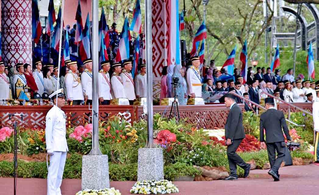 Tuan Yang Terutama Yang di-Pertua Negeri Sabah, Tun Juhar Mahiruddin (kanan), bersama barisan pemimpin negeri menyaksikan perbarisan yang penuh kemegahan sempena Ulang Tahun Rasmi ke-71 TYT Sabah.