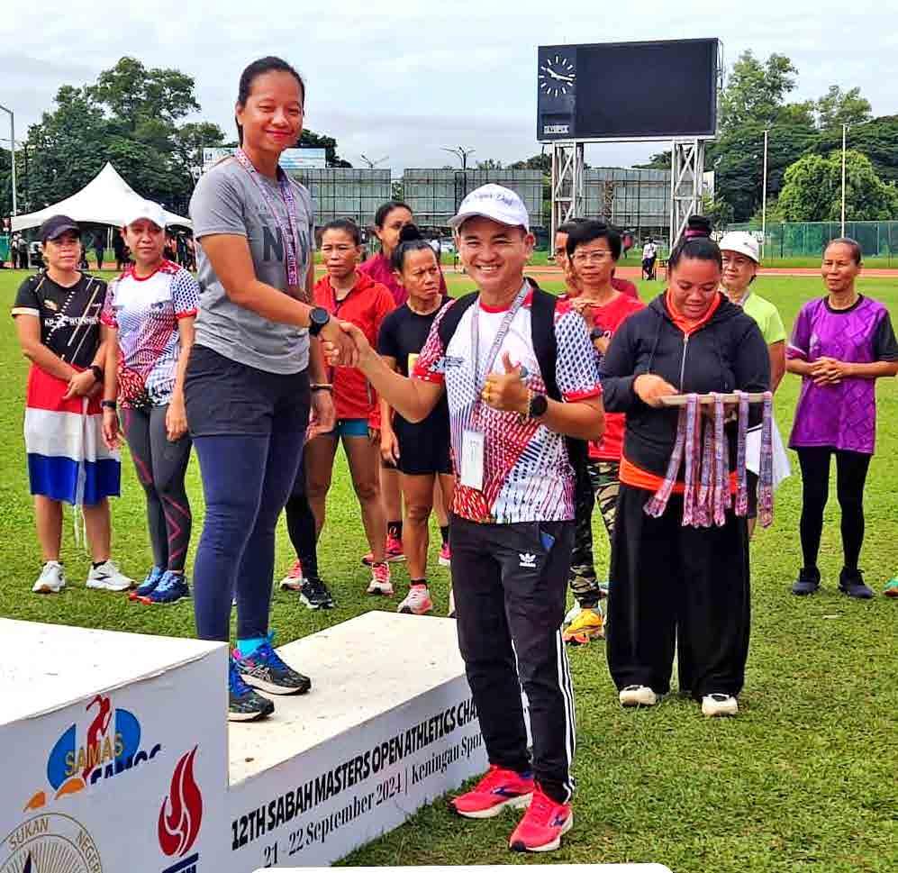 Suzanirihwati (kanan) menerima pingat gangsa acara lompat kijang dan perlumbaan berjalan kaki 3000 meter 36th Malaysian International Open Masters Athletics Championships di Stadium Mini MSN, Bukit Jalil, Kuala Lumpur.