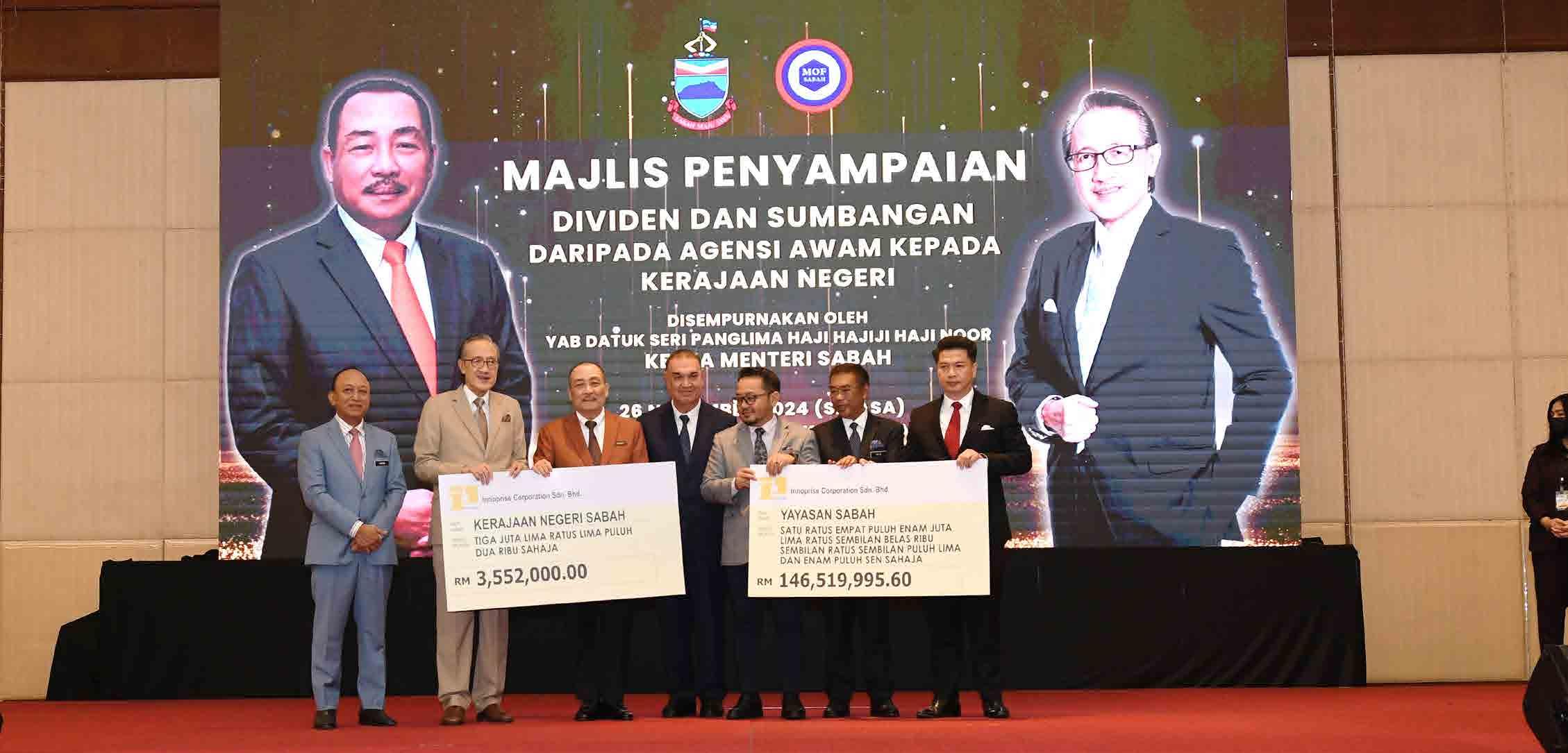 Innoprise Corporation Sdn. Bhd. (ICSB) telah menyerahkan cek dividen kepada Kerajaan Negeri Sabah dan Yayasan Sabah berjumlah RM3.6 juta dan RM146.5 juta masing-masing dalam satu majlis yang berlangsung di The Magellan Sutera, Sutera Harbour, Kota Kinabalu pada 26 November 2024.