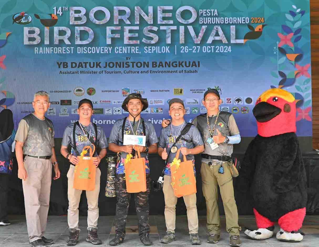 Mayor Bandaraya Kota Kinabalu, Dato’ Sri Dr. Haji Sabin bin Samitah (berdiri, tengah) menyampaikan piala dan sijil tempat ketiga kepada salah seorang kontinjen perbarisan Kumpulan Yayasan Sabah, Encik Ahmad Fauziee bin Wasimin (berdiri, tiga dari kanan).