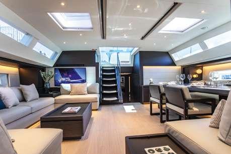κατάμαυρο κύτος του. Διαθέτει τη δοκιμασμένη διαμόρφωση RS (ανυψωμένο σαλόνι), η οποία επιτρέπει στους επιβάτες που κάθονται στο σαλόνι να έχουν το γύρω τοπίο σε άμεση θέα χάρη στα άφθονα παράθυρα του κύτους που αφήνουν το φυσικό φως να γεμίσει και να φωτίσει τους εσωτερικούς χώρους. Η σουίτα του πλοιοκτήτη βρίσκεται μπροστά από το σαλόνι για μέγιστη ιδιωτικότητα με μια καμπίνα VIP κοντά και δύο καμπίνες επισκεπτών πίσω από το σαλόνι (τα δύο μονά κρεβάτια της δεξιάς καμπίνας μπορούν να μετατραπούν σε διπλό κρεβάτι) για συνολικά οκτώ άτομα. Το σαλόνι στη μέση του πλοίου είναι ένας φωτεινός και ανοιχτός χώρος όπου όλοι οι καλεσμένοι μπορούν να χαλαρώσουν με άνεση στους καναπέδες