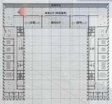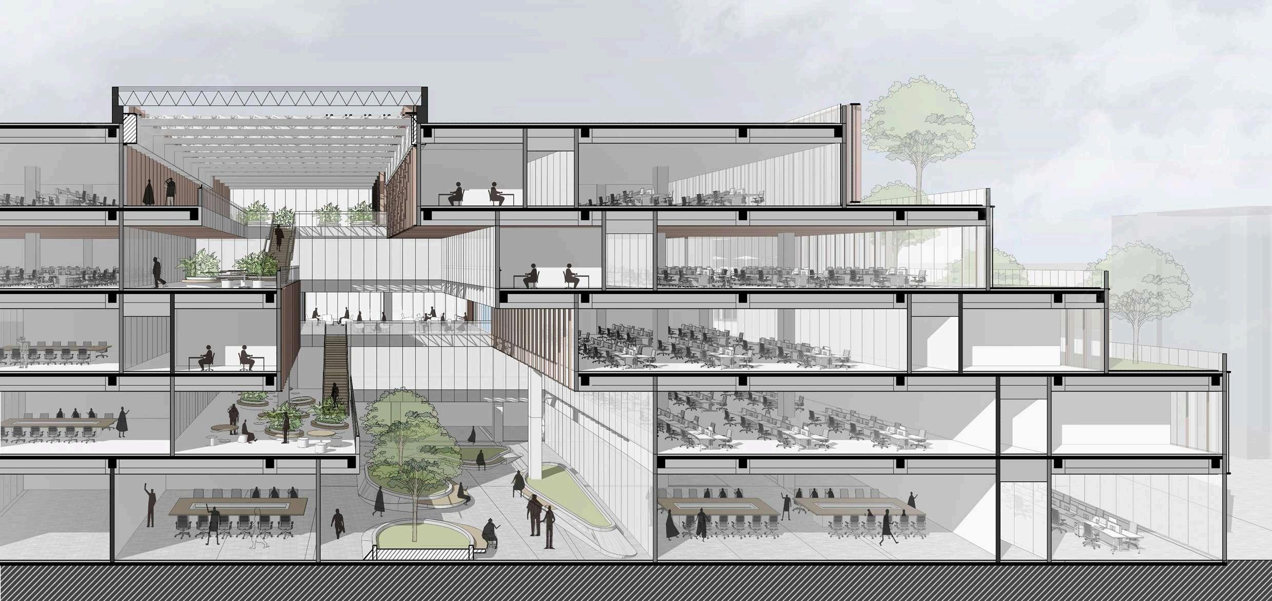 The north side opens to sea views, extending into multi-level green terraces that blend seamlessly with the architecture, creating an ecological space The vertical layout integrates service, office, and public functions, with the ground floor accessible to the public Two main volumes at the ground level are connected by a corridor, while a floating second-level platform links the spaces, forming a cohesive urban interface
