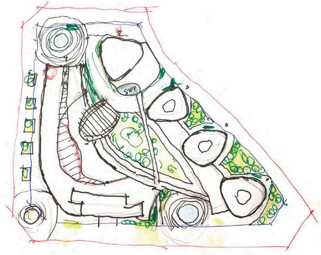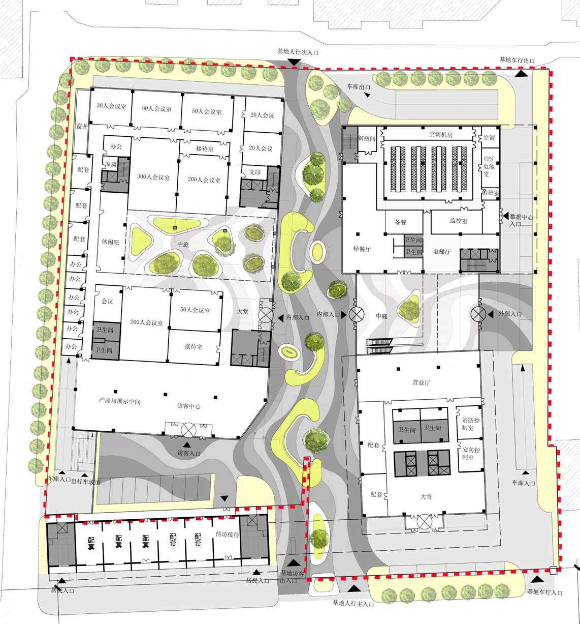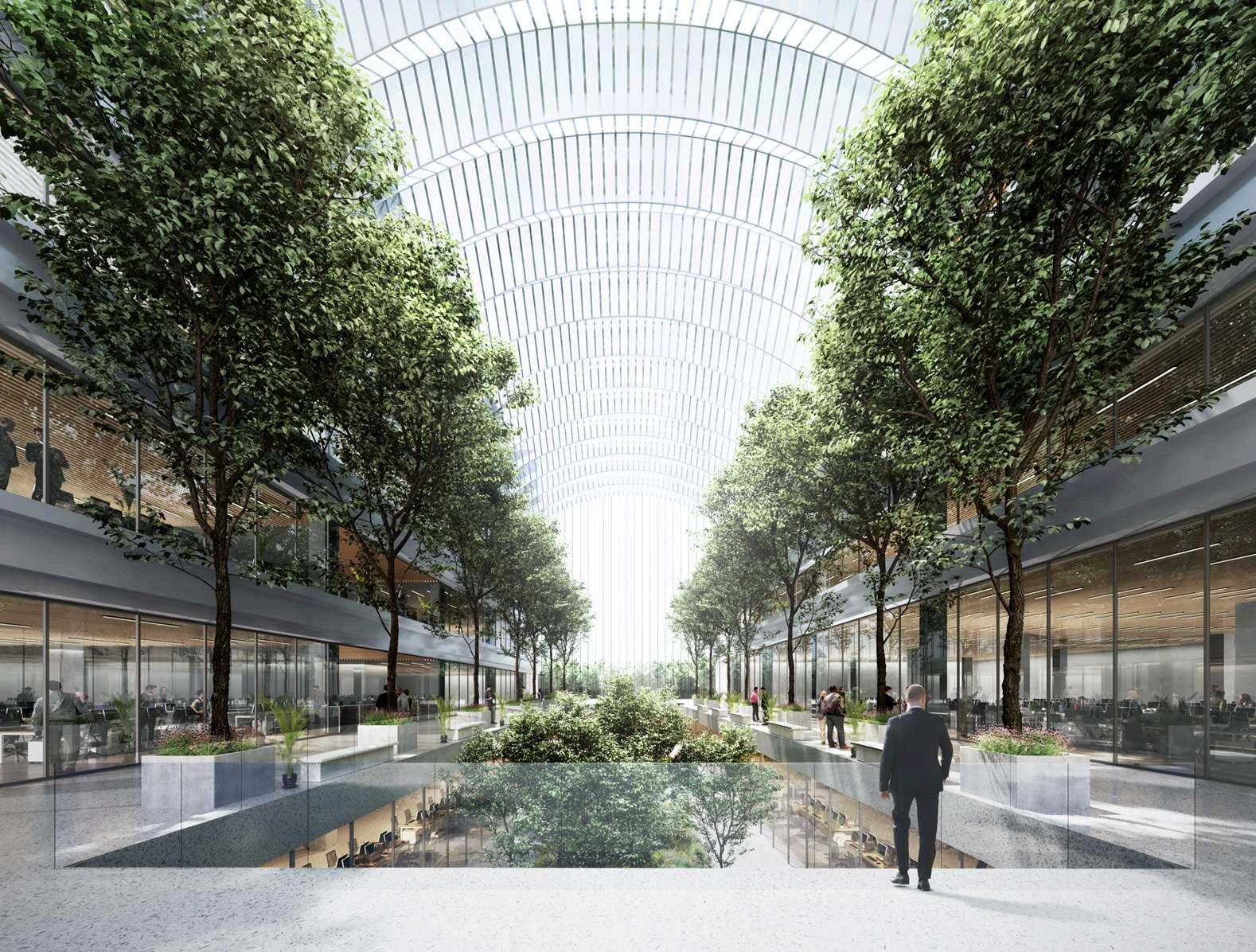 Scheme 2’s design concept divides the space by function, with the city-facing side separated by a green valley that highlights sustainability and the garden office concept