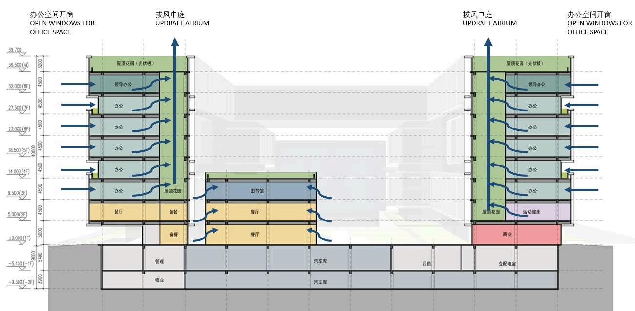 This section shows how the building uses natural ventilation and an elevated atrium to enhance sustainability