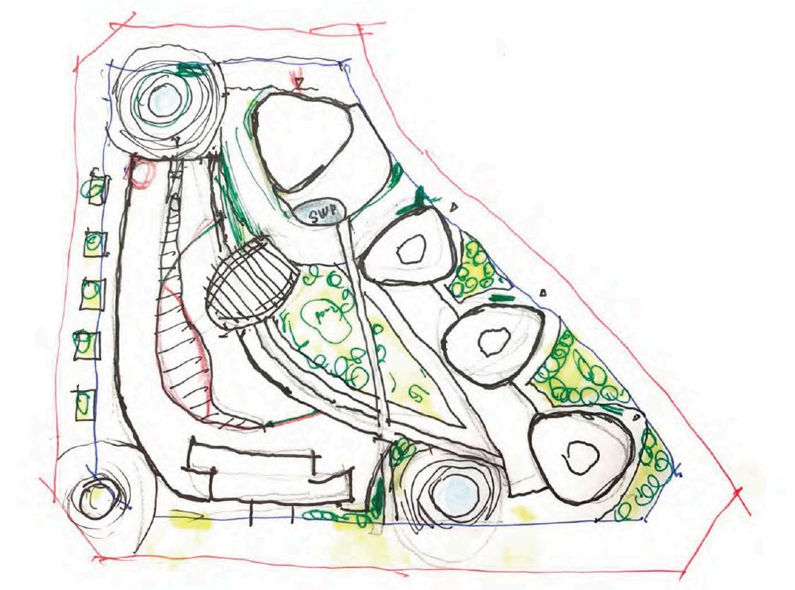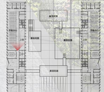 Scheme 2’s design concept divides the space by function, with the city-facing side separated by a green valley that highlights sustainability and the garden office concept