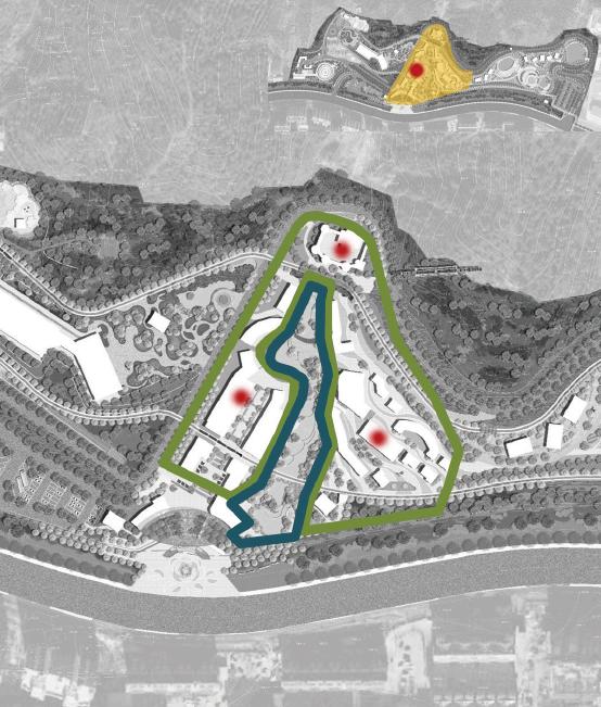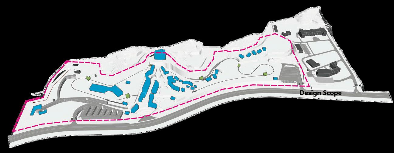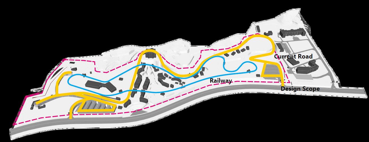 Set against a mountainous backdrop with significant elevation changes, the project site is semi-developed with scattered existing buildings that disrupt spatial continuity. The design preserves these structures while introducing new functions, optimizing the road network, and integrating railway elements. Key challenges include managing elevation differences, reorganizing circulation, and ensuring architectural harmony with the surroundings The proposal addresses these by redefining site functions, stabilizing slopes, refining road layouts, and enhancing landscape integration to create a cohesive and functional environment.