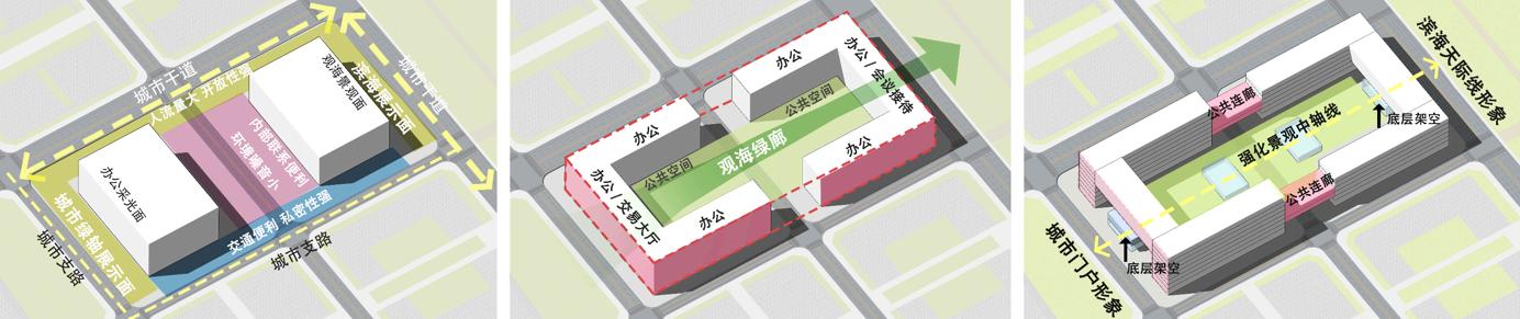 The north side opens to sea views, extending into multi-level green terraces that blend seamlessly with the architecture, creating an ecological space The vertical layout integrates service, office, and public functions, with the ground floor accessible to the public Two main volumes at the ground level are connected by a corridor, while a floating second-level platform links the spaces, forming a cohesive urban interface