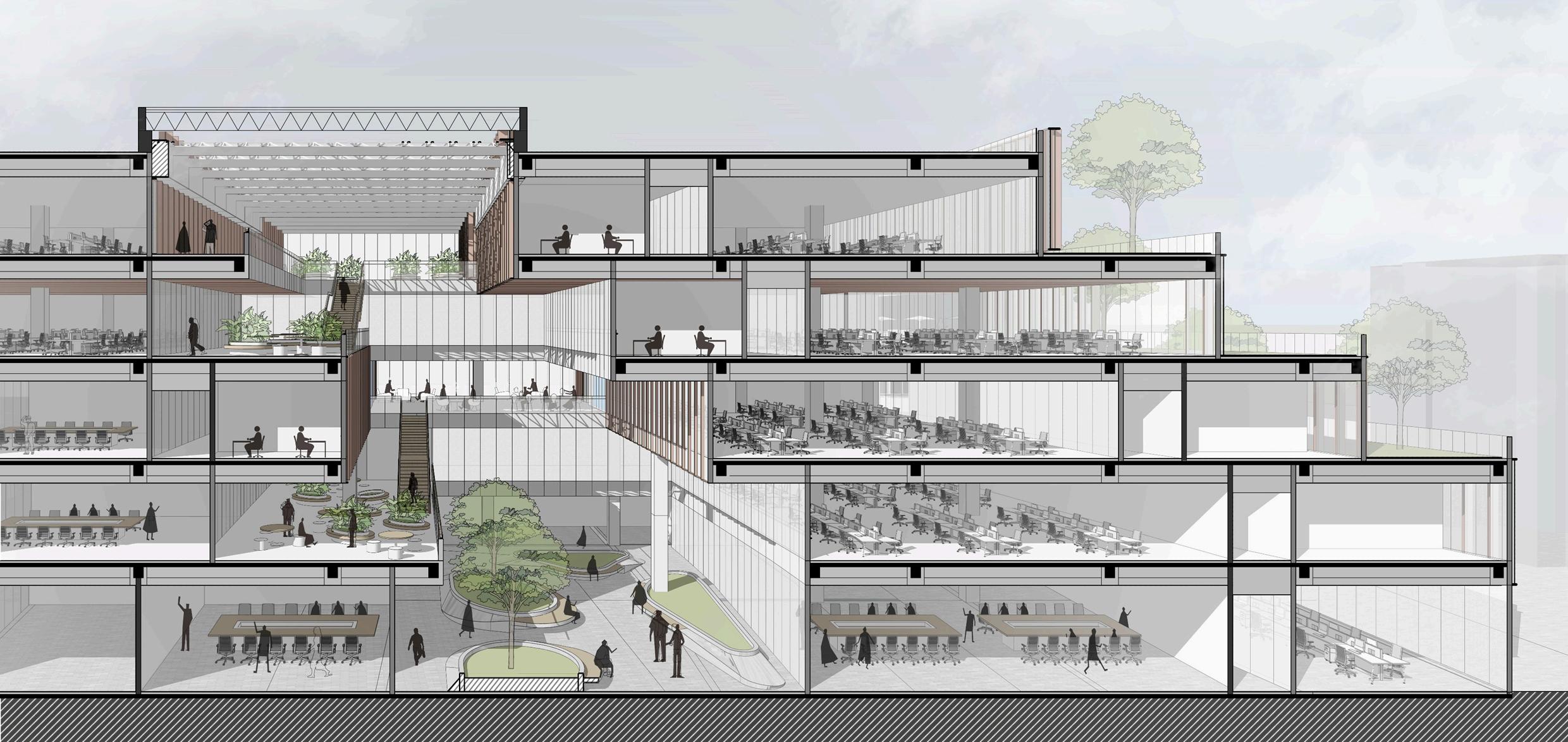 This section shows how the building uses natural ventilation and an elevated atrium to enhance sustainability