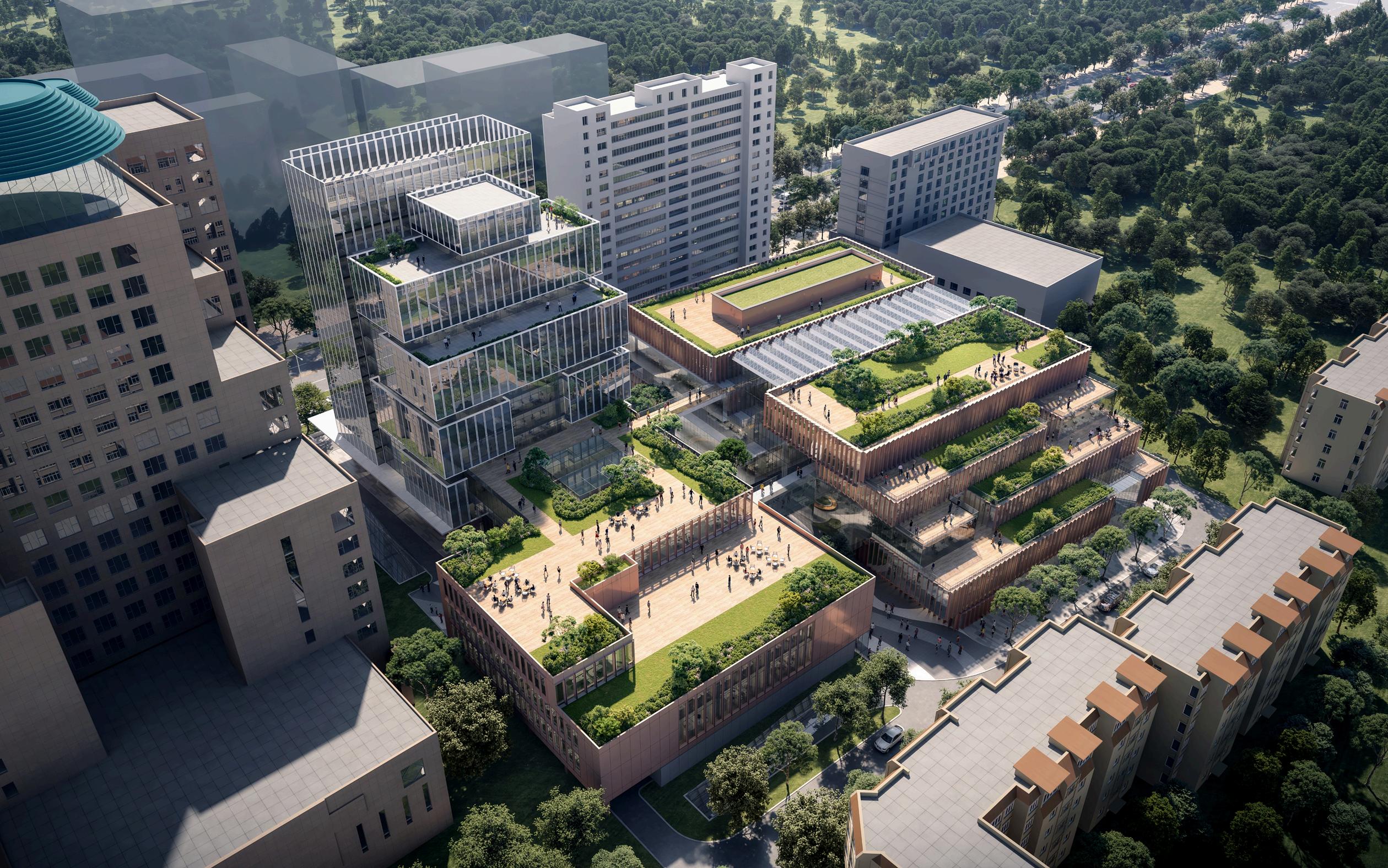 Fengsheng High School, located in the heart of Beijing, seamlessly blends modern educational concepts with sustainable design. The school features a vertical layout to maximize limited urban space, enhancing connectivity and spatial flow. Drawing inspiration from Beijing’s architectural heritage, elements such as grey brick are integrated with contemporary sustainable strategies, striking a balance between tradition and modernity Sunken courtyards and rooftop greenery provide open, interactive learning spaces while optimizing natural resources for a healthier educational environment.