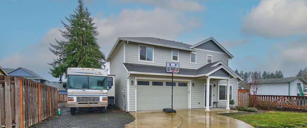 Willamina: 5 bedroom, 3 bathroom, living room w/ gas fireplace, family room, vaulted ceilings, open concept, hardy plank siding, vinyl windows.