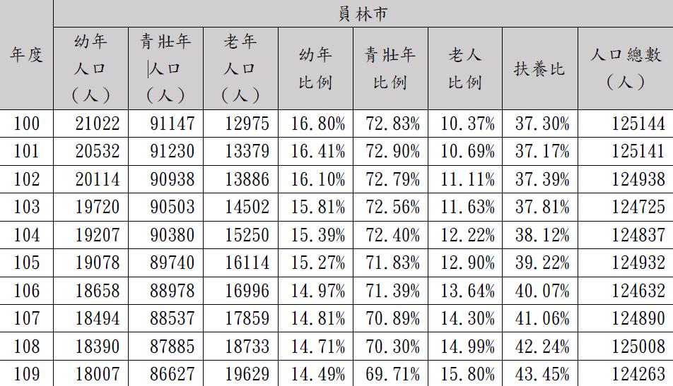 18 四、 交通條件分析 員林市屬南彰化地區核心,為鐵路、公路運輸集結點,內有台 1 線貫穿整 個員林都計區,並於計畫區西南側外圍與台 76 線由員林交流道銜接,往東可接 至中興系統後上國道三號,往西則可接至埔鹽系統上國道一號。在大眾交通運 輸上,都計區內有全彰化運量最高的臺鐵員林車站,日平均上下車人次為 14,454 人,往北可至彰化車站,往南則可至田中車站;此外區內亦有員林轉運 站,提供往高鐵彰化站、田中、彰化、草屯、溪頭等地的班車服務。 圖 二 7 基地周圍交通條件示意圖 資料來源:變更員林都市計畫(舊市區)細部計畫(第一次通盤檢討)規劃技 術報告 五、 人口條件分析 員林與其周圍鄉鎮以員林市為核心,形成大員林生活圈,依據彰化縣民正 處民國 110 年人口統計資料,員林市之人口約為 124,263 人,周圍之大村鄉 (38,457 人)、埔心鄉(34,451 人)、永靖鄉(36,300 人)、田尾鄉(26,691 人)、社頭鄉(42,436 人)以及田中鎮(40,717 人)所形成的大員林地區人口 共計 343,315 人。 員林市人口結構呈現都市型,以青壯年人口比例最高,為 69.71%,但青壯 年與幼年人口比例逐年下降,如下表所示: