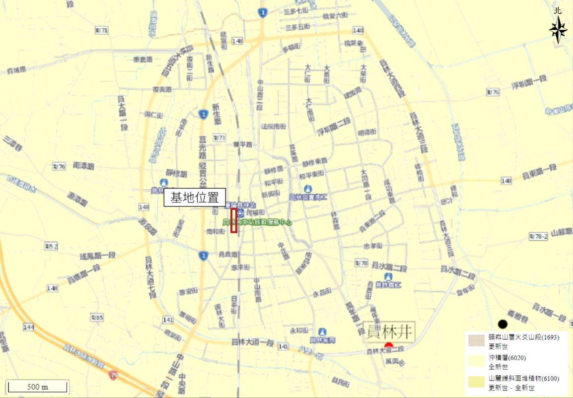 圖 二 4 基地地質圖 資料來源:經濟部中央地質調查所,地質資料整合查詢 三、 區域環境敏感地區概況 員林部分地區有淹水潛勢情形,然開發基地所在之區域無地勢較高,屬無 淹水潛勢地區;將所有環境敏感圖層進行疊圖分析後,可以發現計畫區內無任 何環境敏感區域。員林大部分區域屬土壤液化中高潛勢地區,本計畫範圍所在 之員林車站周圍區域,雖屬土壤液化低潛勢區域,然員林東側有員林斷層經 過,因此仍需注意建築耐震等相關規範;文化資產部分,開發基地未於文化環 境敏感區域內,開發基地北側有一歷史建築(員林穀倉)。 綜上所述,本計畫開發範圍無涉及環境敏感地區,然因活動斷層經過,因 此仍需注意建築耐震等相關規範。