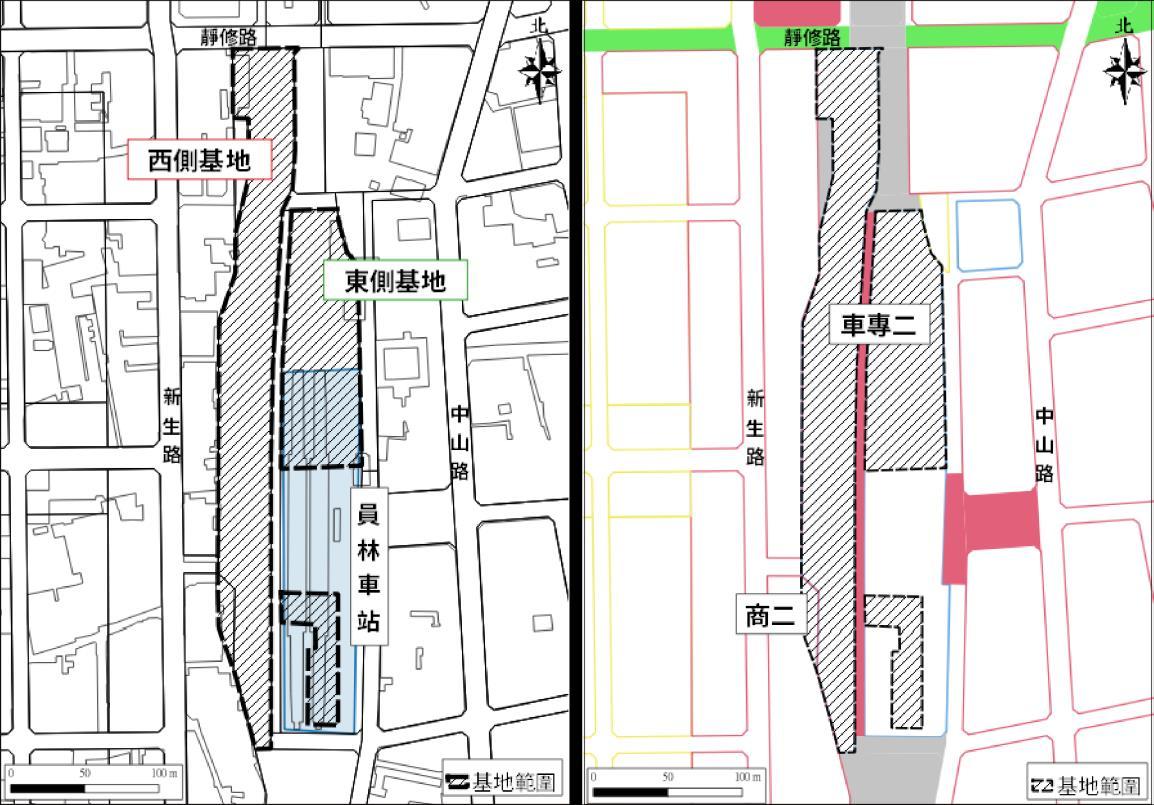 13 第二章 土地取得方式與基本條件 第一節 土地基本條件 一、 範圍與基本資料 (一) 基地範圍 本計畫位於彰化縣員林市,屬員林火車站周邊都市計畫範圍內,位於員林 舊市區之臺鐵員林車站西側、北側與部分站體空間,如下圖二 1 所示: 圖 二 1 基地位置示意圖 資料來源:本計畫繪製 (二) 基地面積 基地總面積為 24,198 86 平方公尺,基地以車站後站前方一條細部計畫廣 場兼道路用地為界,共分為西側基地與東側基地兩塊,其中西側基地面積為 16,289.52 平方公尺,東側基地面積為 7,909.34 平方公尺,詳如下圖。 (三) 土地使用分區 基地共有二種土地使用分區,分別為第二種車站專用區,面積 23,697.76 平方公尺(佔 94.66%),建蔽率與容積率分別為 70%、300%;以及第二種商業 區,面積 1,336.66 平方公尺(佔 5.34%),建蔽率與容積率分別為 60%、350 %。
