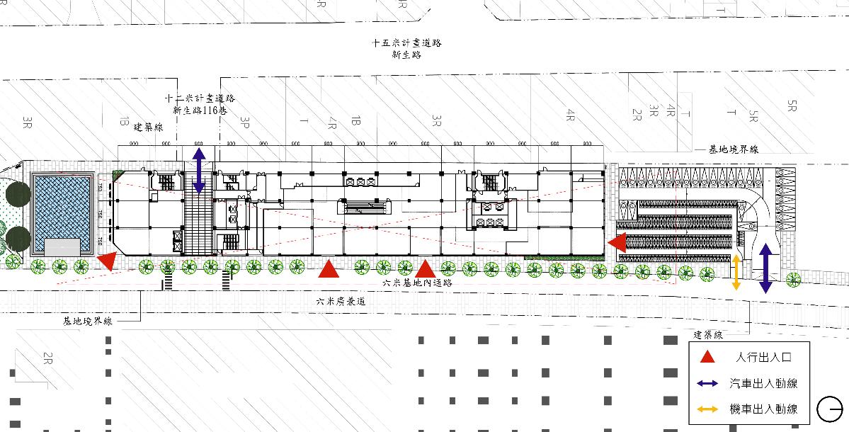 1. 留設未來計畫道路空間 考量員林車站周邊路網連續性與道路動線,開發基地內須留設北和街 11M、至善街 15M 與南和街 11M 未來都市計畫變更為道路用地之空間,以此串 連火車站東西兩側之商業行為。