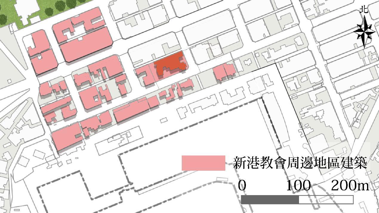3. 建築物量體高度 依據景觀分析章節之新港教會與周邊地區分析內容,新港教會南側與西北