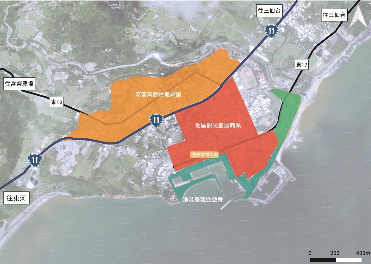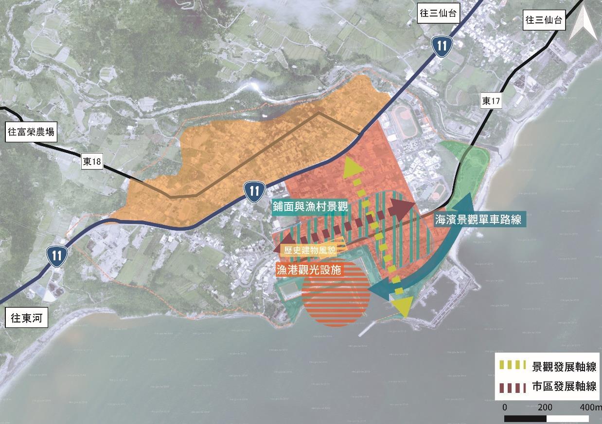 格、招牌樣式、鋪面設計等,並以各道路物 件如路燈、人行道設計等營造漁村風貌。