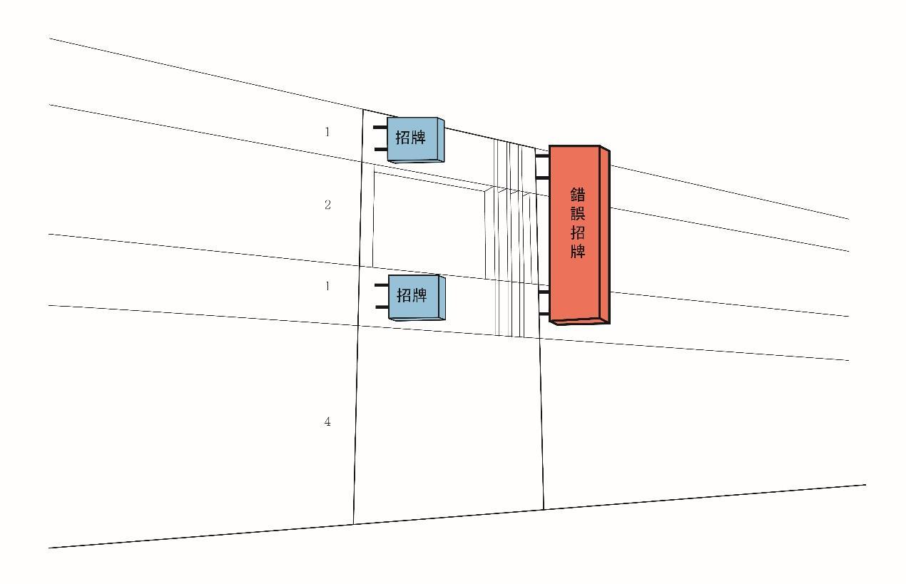 207 圖 九 15 招牌配置位置示意圖 資料來源:本計畫繪製 故本計畫訂定以下都市設計準則: 表 九 11 景觀計畫管制目標與內容 編號 管制目標 管制內容 1. 招牌風格與色彩 設計管制 側懸式廣告招牌色彩應與建築環境保持和諧,避免 高明度、高彩度之色彩設計;各式廣告招牌風格無 業務需求應力求統一,並應參考周邊街道環境、鄰 近建築之設計風格。 2. 招牌類型、大小 管制 側懸式廣告:突出牆面線一公尺以內、縱長四公尺 以內;或突出牆面線一點五公尺以內、縱長二公尺 以內;正面式廣告:縱長一點五公尺以下。以上側 懸式及正面式皆需符合規定。 3. 延續風貌、招牌 大小配置管制 符合上述街屋立面之適當比例者,側懸式廣告僅得 限縮於牆面部分(非開窗部分),以維持開窗之延 續性。 資料來源:本計畫製作