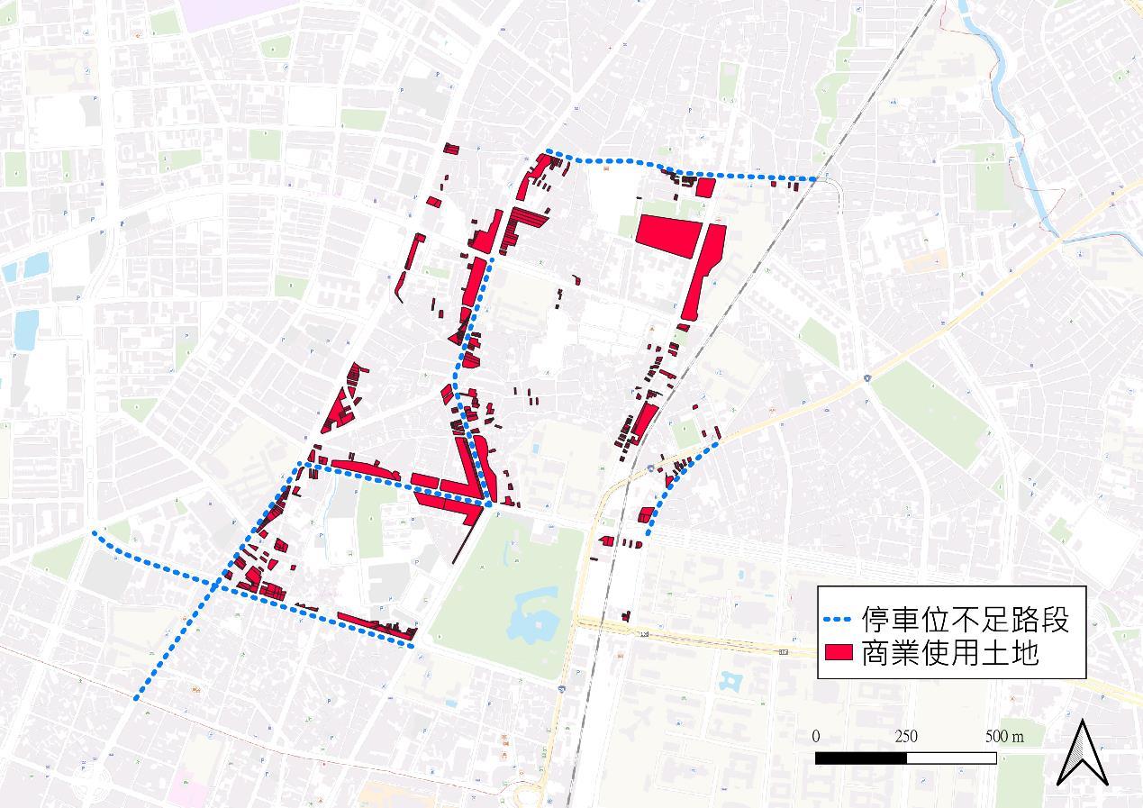 課題八:沿路商業密集區停車位不足 1. 說明 臨路商業區的主要以公園路、西門路和公園北路為最密集,但同樣也是在 這些商業較密集之區域有著停車位不足的情況,因此在這些目前擁有商業活動 或是未來有著發展趨勢的地方需更加重視停車需求問題。