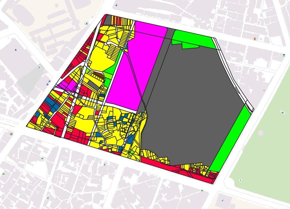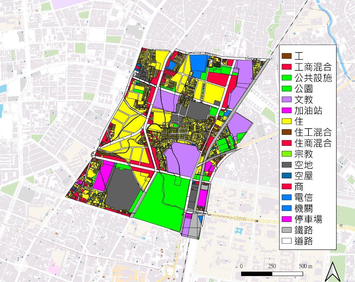146 2. 對策 對策 1:以現有都市公園為中心,串聯鄰近綠地,增加人與生態的活動空間與 緩衝空間。 對策 2:因臺南公園、321 巷、兵工廠屬於早期開發地區,因此老樹較多,苦以 以老樹主題串連三者綠地與古蹟,打造文化主題都會型公園。 圖 6 4 臺南公園人為設施與老樹分布圖 資料來源:護樹聯盟與 open street map 課題五:基地內空地面積比例高,具有發展潛力 1. 說明 基地內約有 13.9 公頃的空地,除了 A1 區為兵配廠之外,大部分劃定為住 宅區與公園。