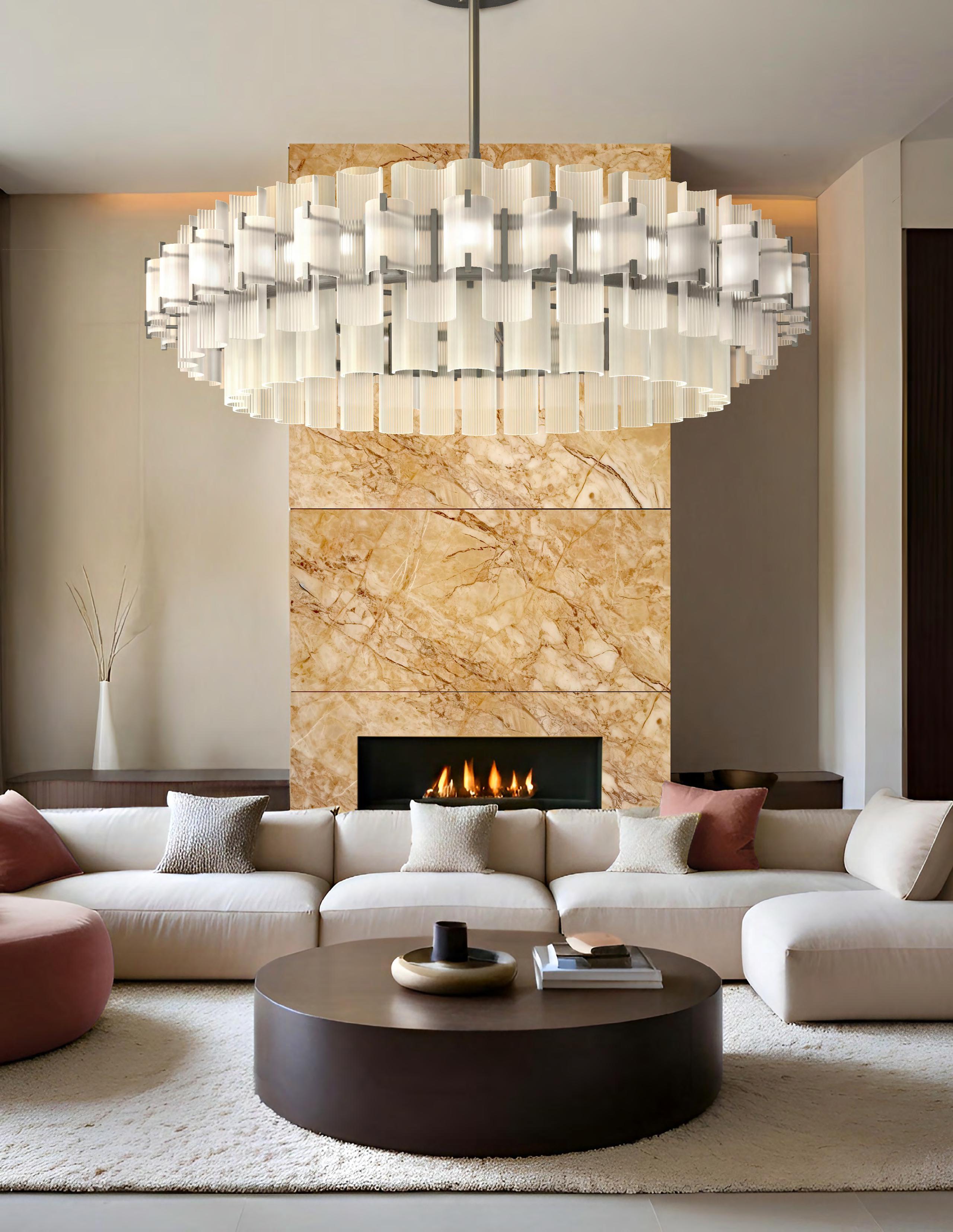 Fluted, curved glass elements radiate within a graceful volume, creating a chandelier that feels both bold and refined. This dramatic centerpiece brings haute couture glamour to elevated interiors.