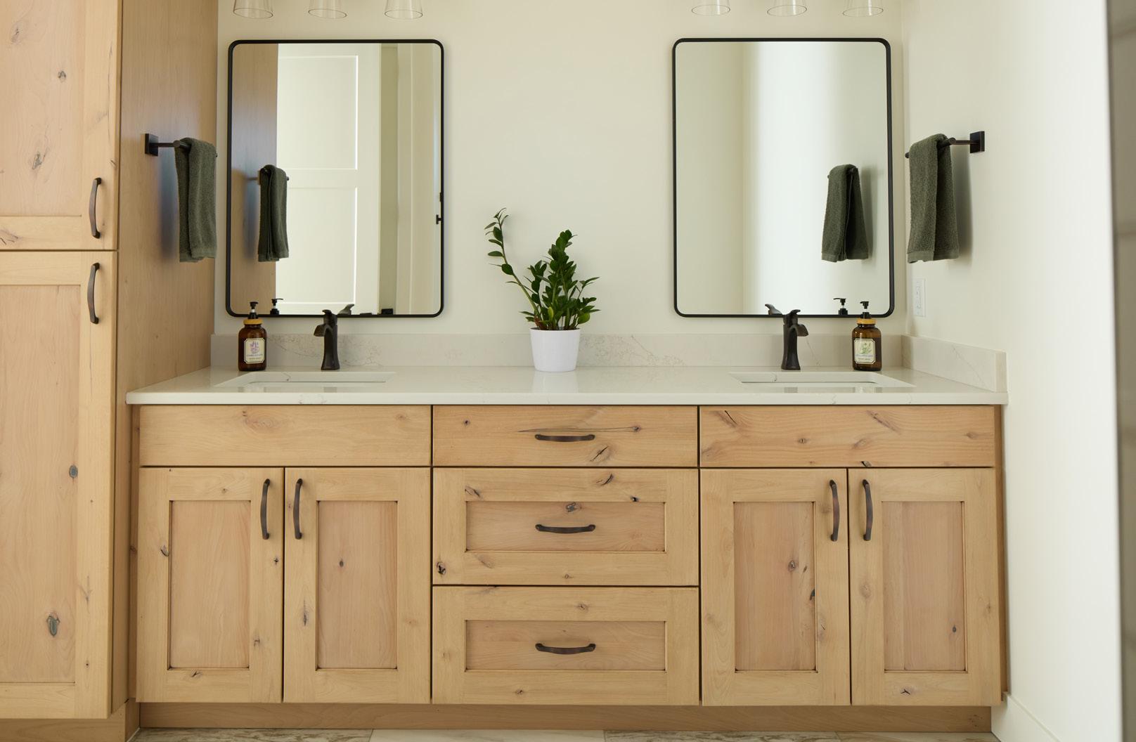 Jordy delights in showing off double sink high-top vanity, fashioned of knotty alder with glaze. Each drawer is organized. “I’m a makeup girl,” she says, touching a small cosmetic bag. Her fancy shower fea-