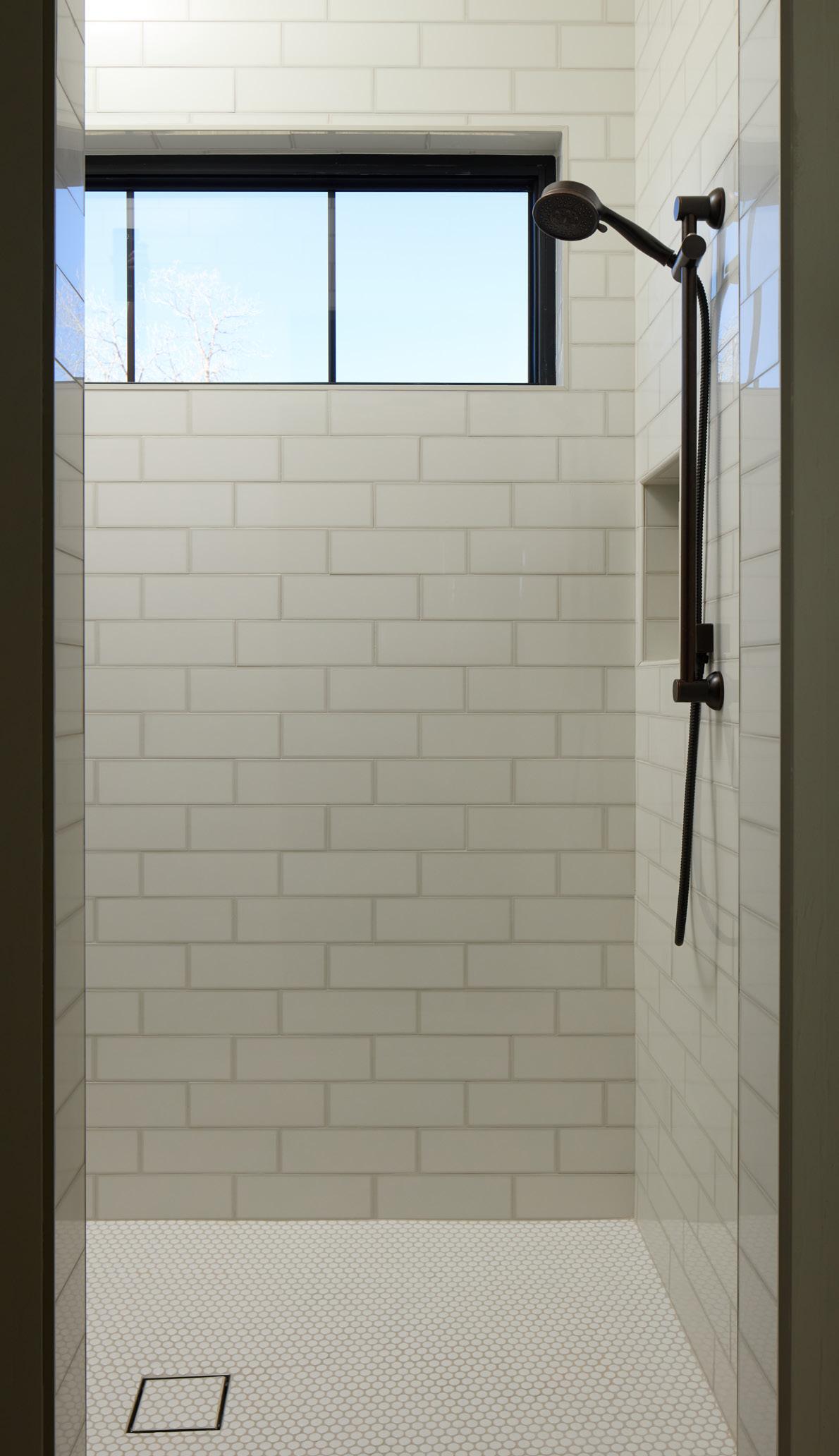 tures large subway tile and a glass shampoo niche.