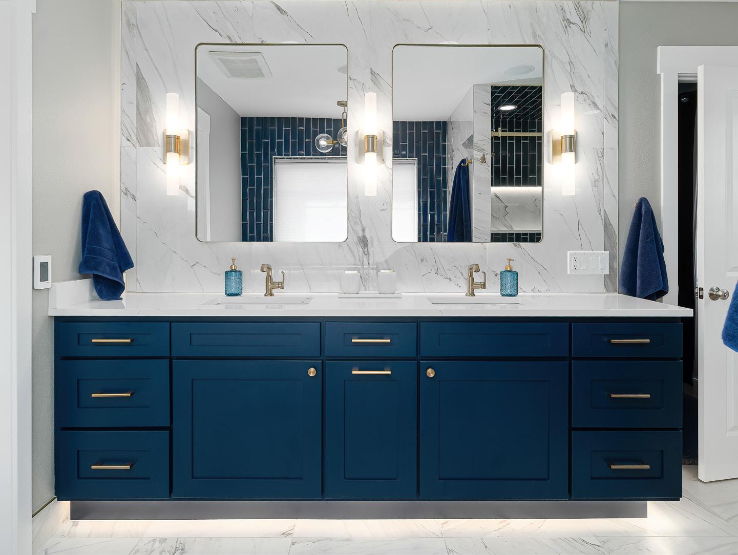“Big statement pieces have become very popular, whether it be a big island with lots of movement, full-height backsplashes, or a fullwall fireplace,” says Jordan Hoffman with Magic City Granite. “People are using stone as the focal point of the room.”