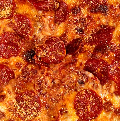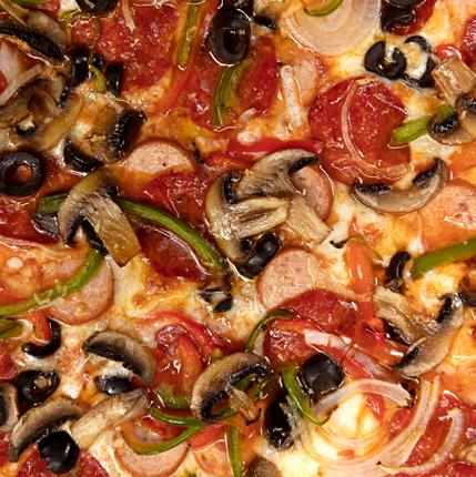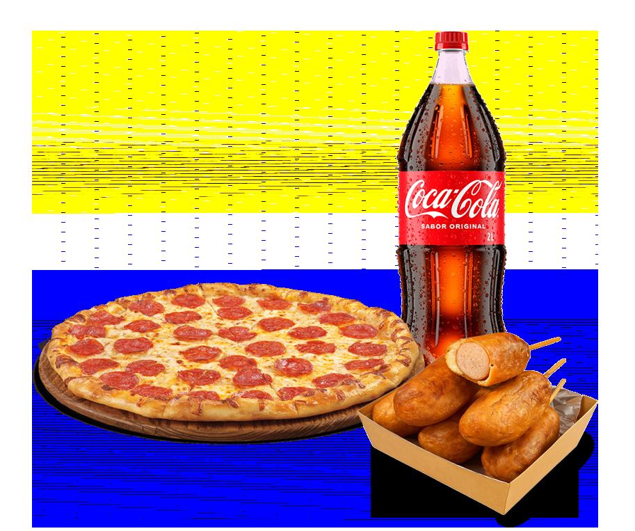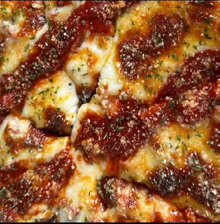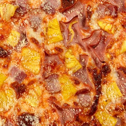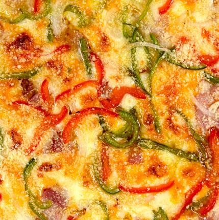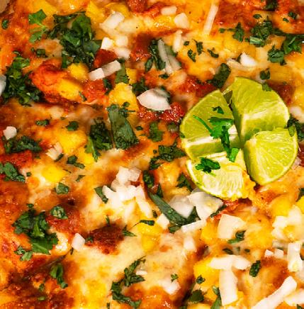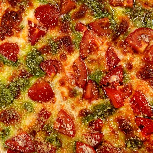 Salsa roja, mozarella, tomate fresco, y pesto de albahaca.