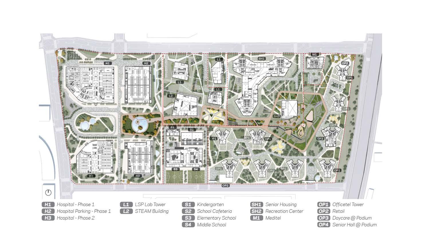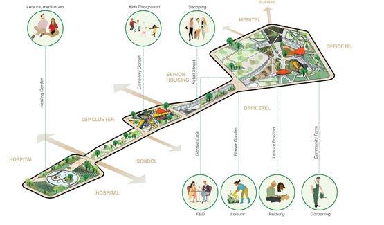 The masterplan is structured around the concept of “Three Gardens, Three Jades,” where each of the three clusters is organized around a central garden and anchored by a symbolic Jade building. The gardens—named Healing, Discovery, and Community—define the unique identity of each cluster by integrating hospitals, research institutions, educational facilities, and residential programs. This strategic organization establishes a complete life cycle encompassing healthcare, industry, research, and living. Ultimately, this approach creates a coherent medical town that unifies these diverse programs within a single urban framework. The Life Science Park (LSP) acts as the central hub of this ecosystem, forming the innovative core that sustains and propels the entire cluster forward.