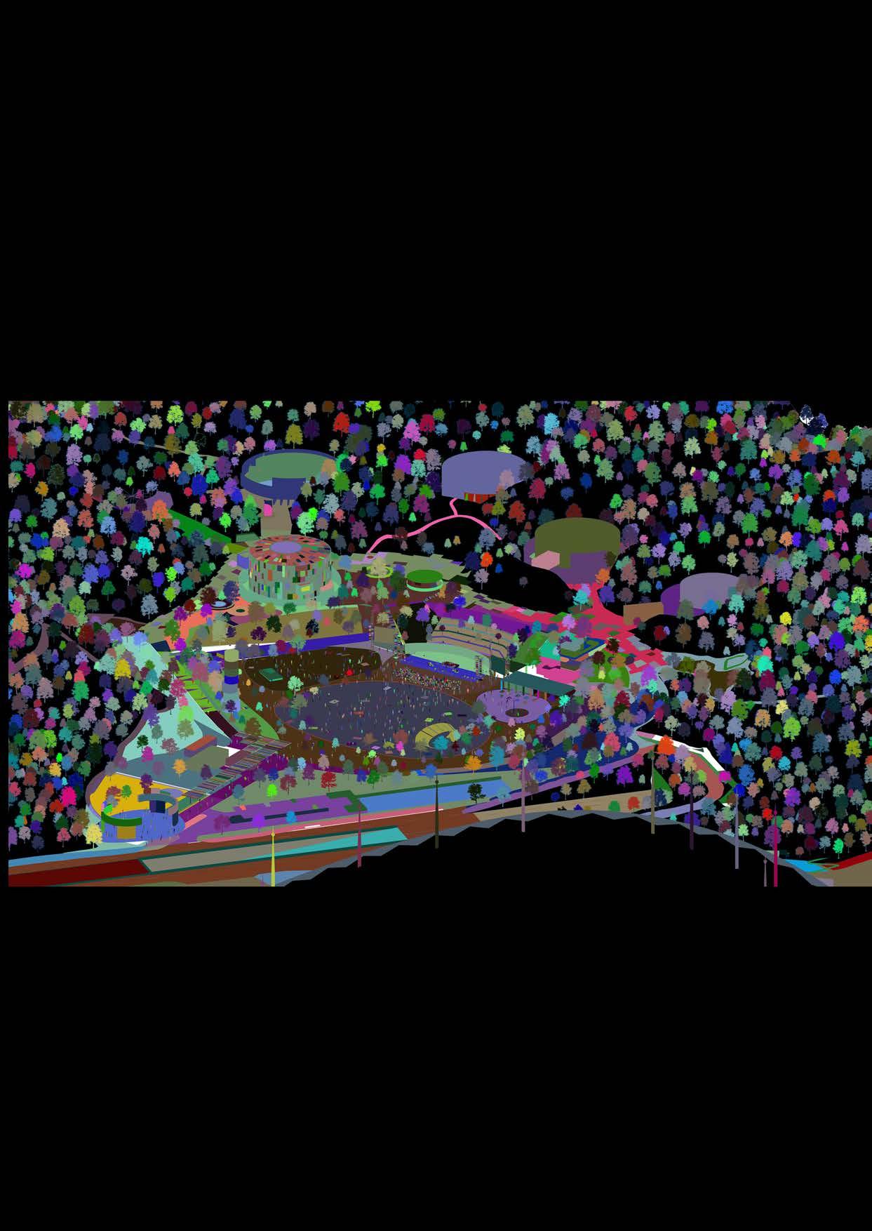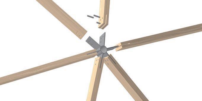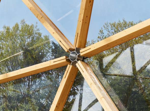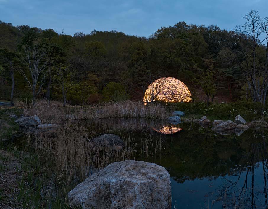 The Camp Dome is a timber dome structure nestled within the forest of Samsung Everland. Composed of a sphere and cylinder, it creates a multipurpose space measuring 13.5m in diameter and 9.4m in height. The spherical geometry recalls planets, water droplets, or Fullerene (C60) molecules—universal forms that achieve maximum volume with minimal material. Laminated timber members are connected by custom steel joints, each fabricated to accommodate the varying geodesic angles. This system produces a lightweight yet robust framework, while the glass cladding maintains a seamless connection with the surrounding landscape.