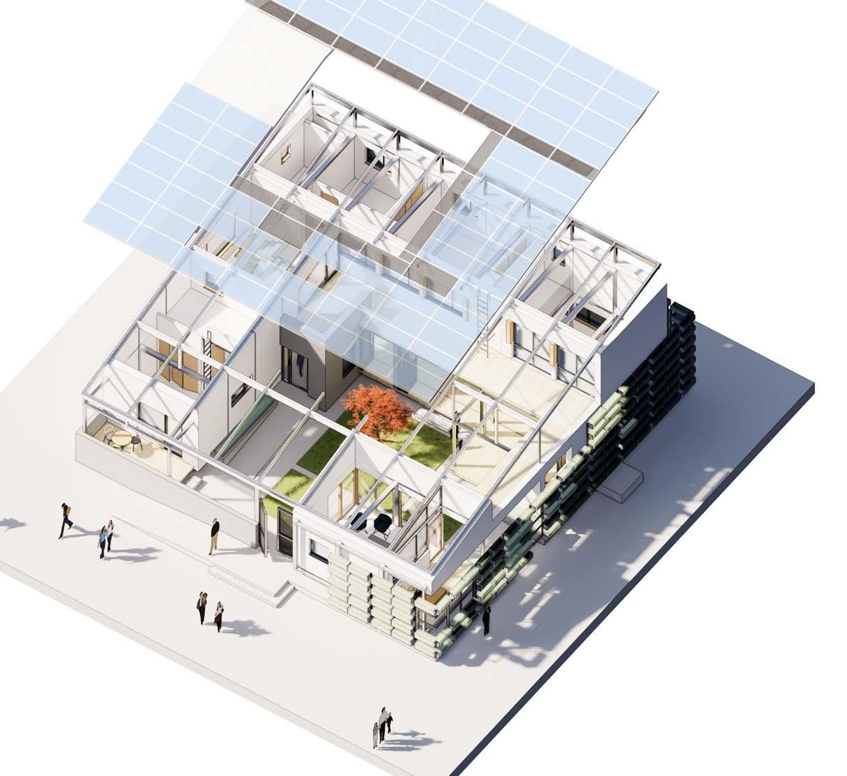 PURe+ aims to establish a new typology of sustainable housing by actively purifies not only the interior but also the exterior. Aggregated as a cluster, it purifies the air of the entire village, going further the whole city. Its modular steel-framed system, allowes the house to be divided for transport, prefabricated in South Korea and shipped in sections to Dezhou, China to be assembled on-site. The project involves collaboration among cross-disciplinary labs- environment labs, and structural engineering labs from universities, specialists in air circulation and modular structures.