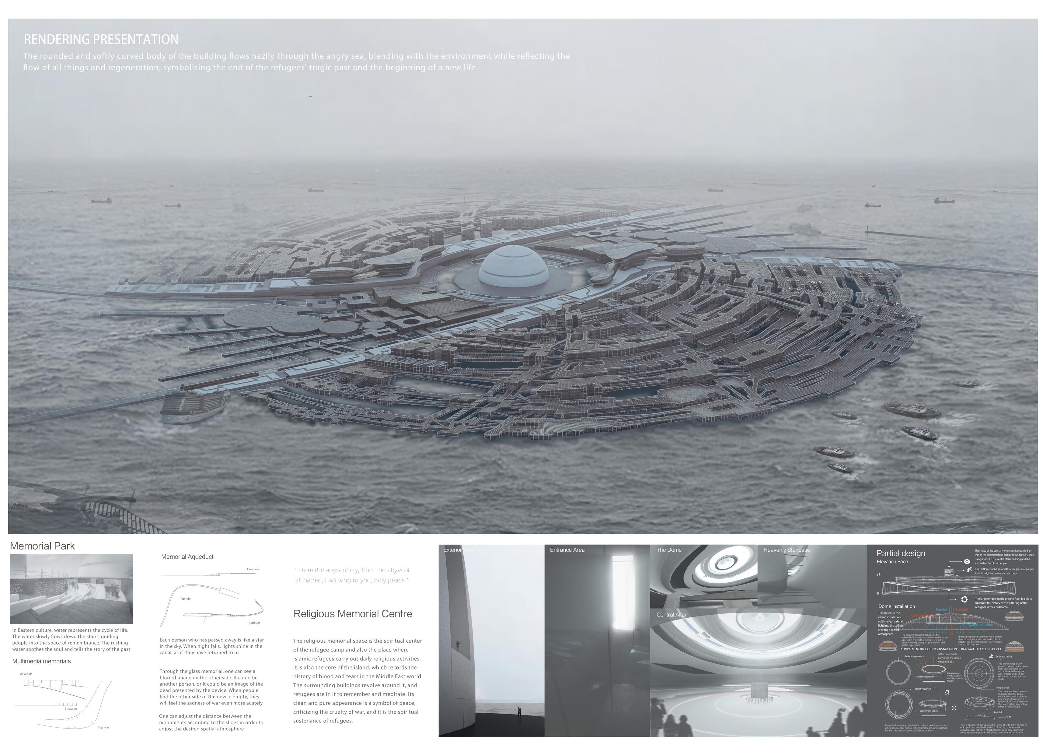 The ve functional blocks of medical area, seashore park, production area, living area and religious memorial space constitute the main functional divisions of the marine refugee camp, which can meet the daily needs of refugees and build an ideal society for future life