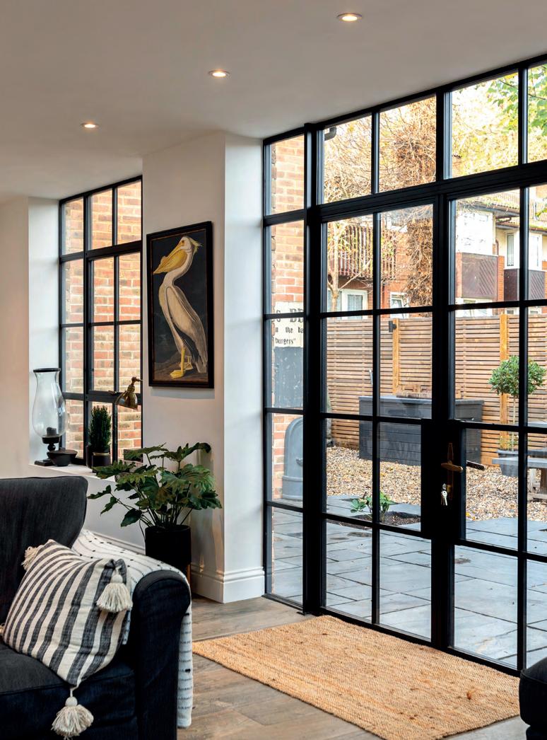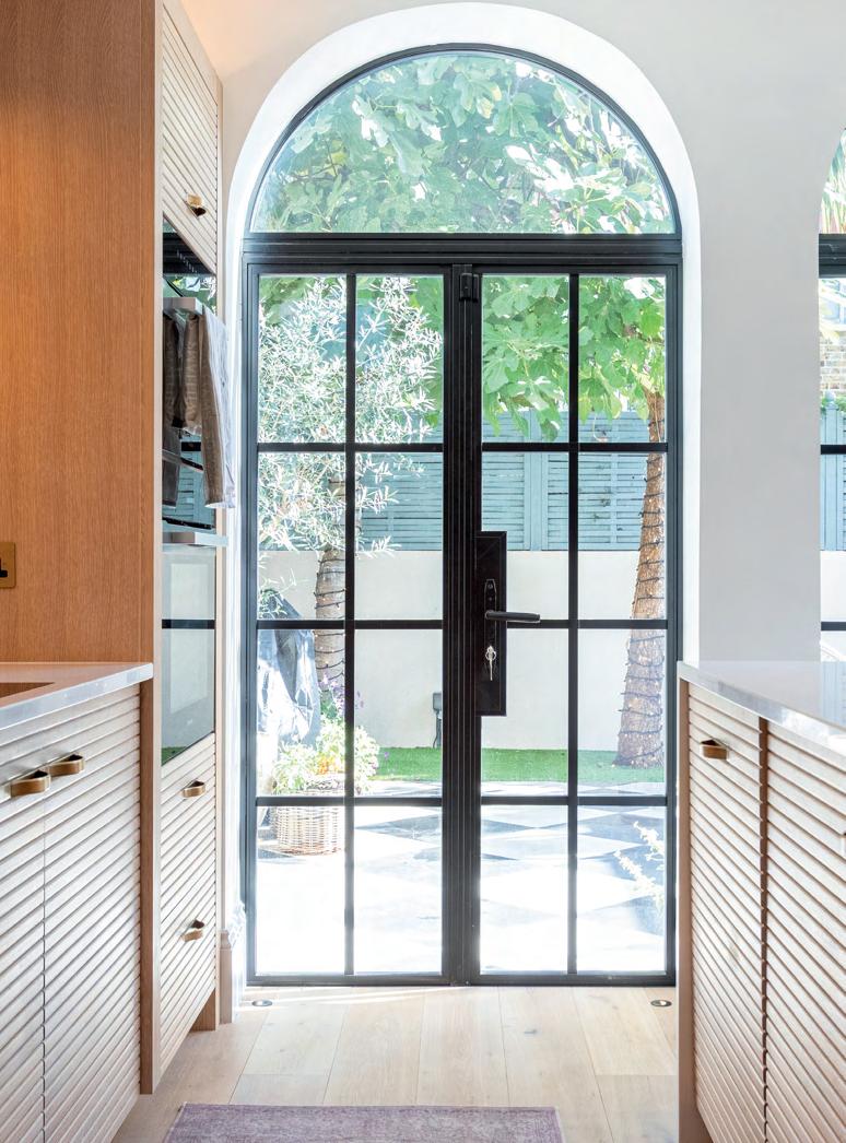 This beautifully renovated home in Fulham features a light-filled contemporary kitchen designed by Humphrey Munson Kitchens. Our YES Steel Look black arched doors opens onto the garden, creating a seamless connection between indoors and out while adding bold architectural character.