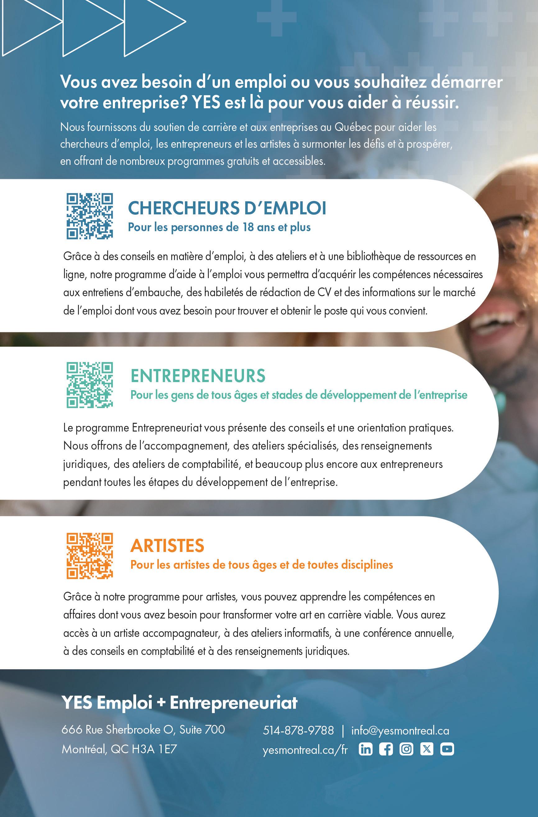 YES Emploi + Entrepreneuriat autonomise les gens de tous horizons à l’aide de services en matière de recherche d’emploi, d’entrepreneuriat et du domaine des arts. Offerts en anglais et disponibles en ligne, en personne ou en formats hybrides, nos programmes aident les gens à bâtir une carrière viable, à lancer et à développer une entreprise, et à transformer le talent artistique en occasions. Guidés par notre mission, nous travaillons à créer un Québec plus inclusif et prospère, où les gens ont la chance de se développer, d’avoir un sentiment d’appartenance et de s’épanouir.