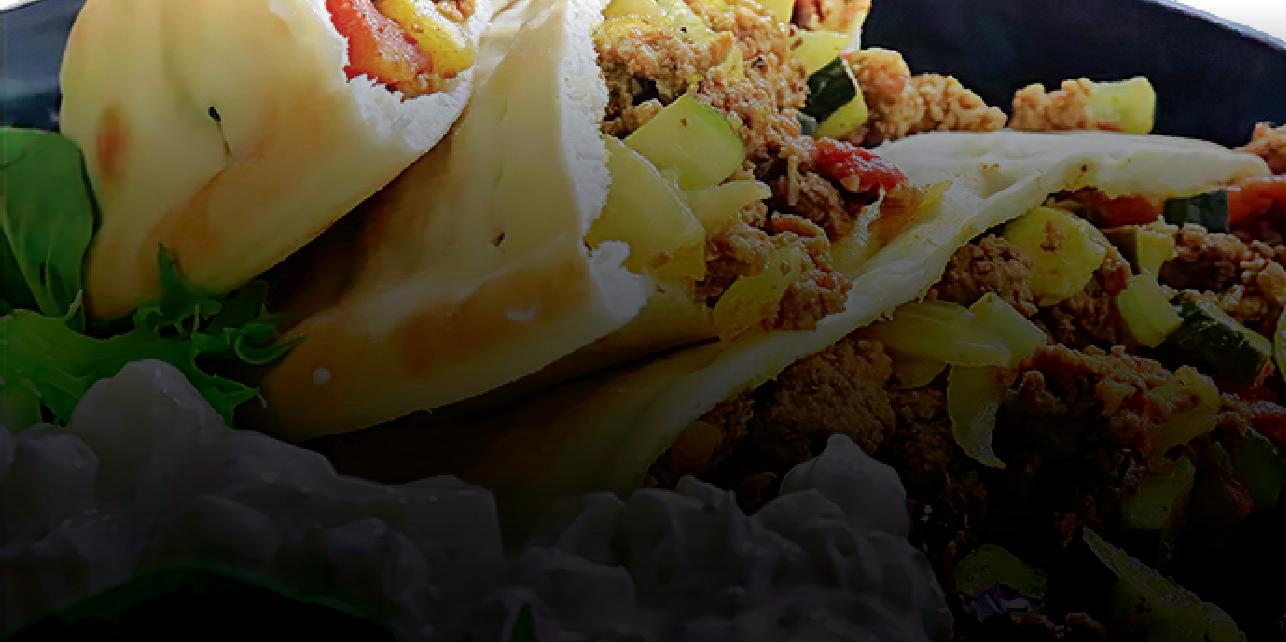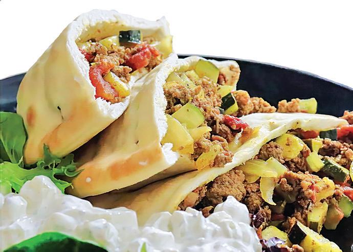 While that’s simmering, mix the cucumber with sour cream and dill, adding salt and pepper to taste, set aside. Spoon meat mixture into pita breads. Top with dollops of cucumber sauce. Serve with a salad.