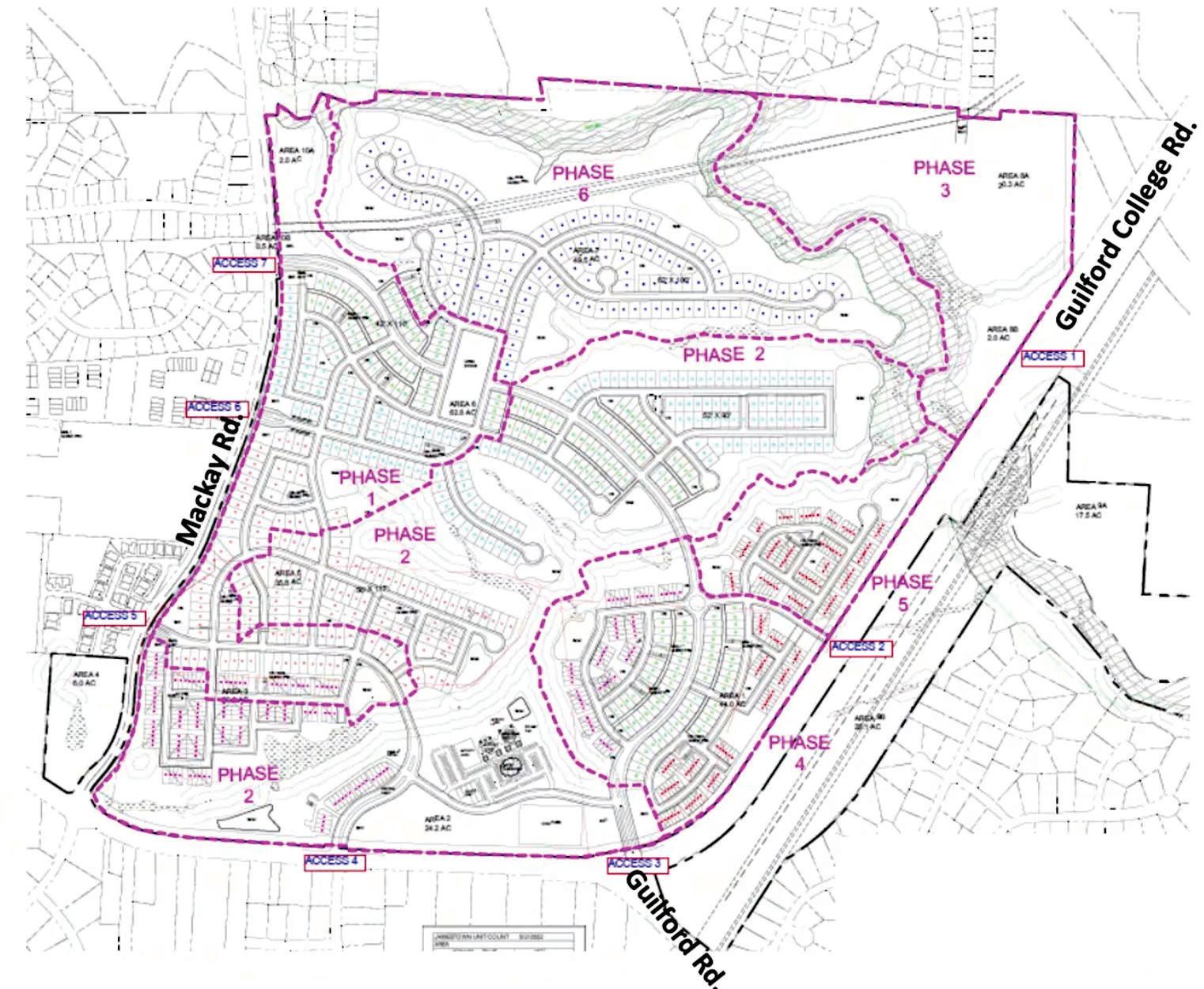 360 units made up of 320 apartments and 40 duplex cottages/casitas in Phase 3 [south of the intersection with Guilford Road and Guilford College Road]. The main access will be on Guilford College Road. It is also governed by an approved rezoning and Development Agreement.”