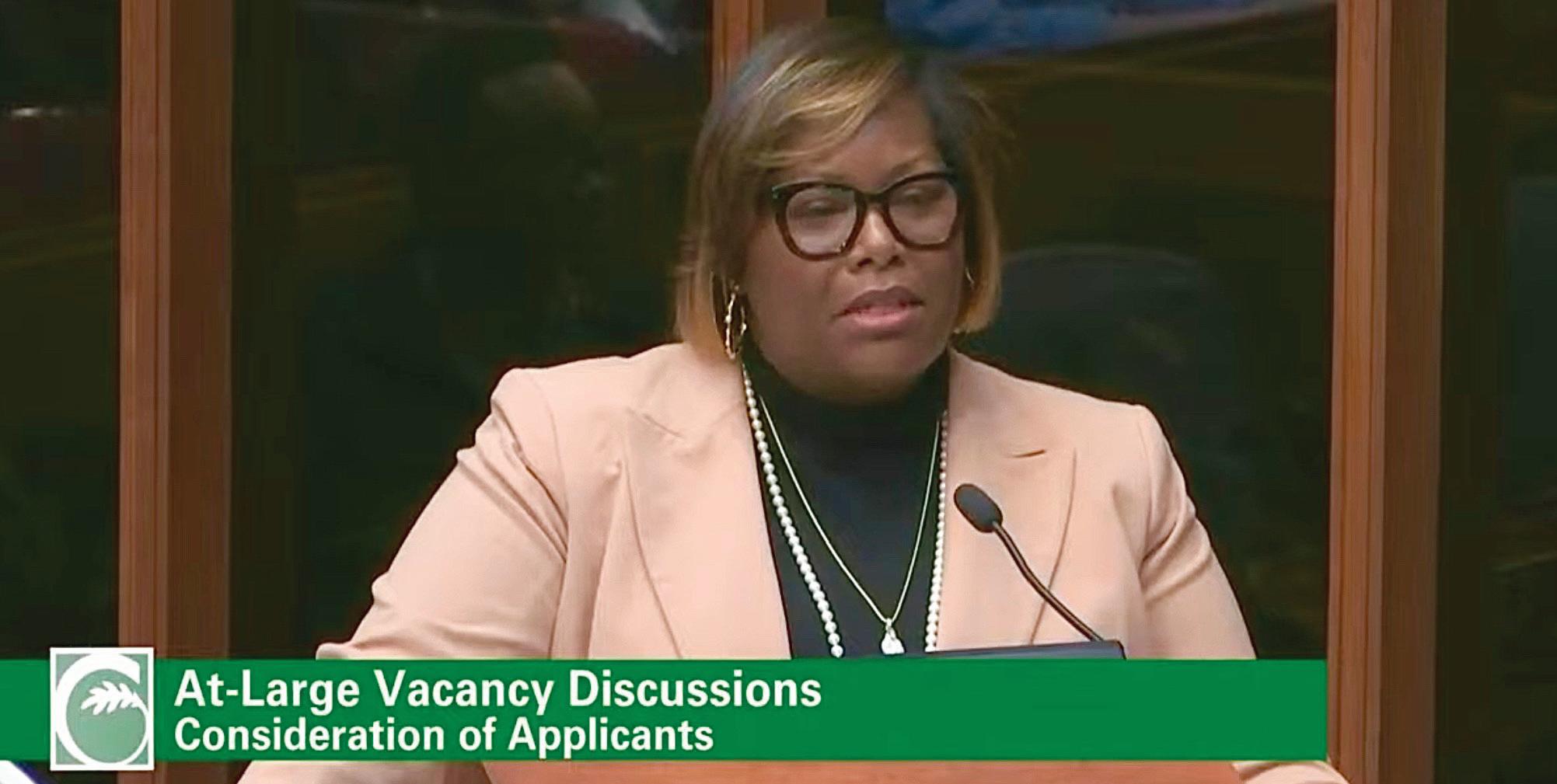 Then Vaughan said the council had reached a consensus about “a candidate with deep comprehensive experience within the city,” and stated, “I move we appoint Jamilla Pinder as Councilwoman At-Large.”