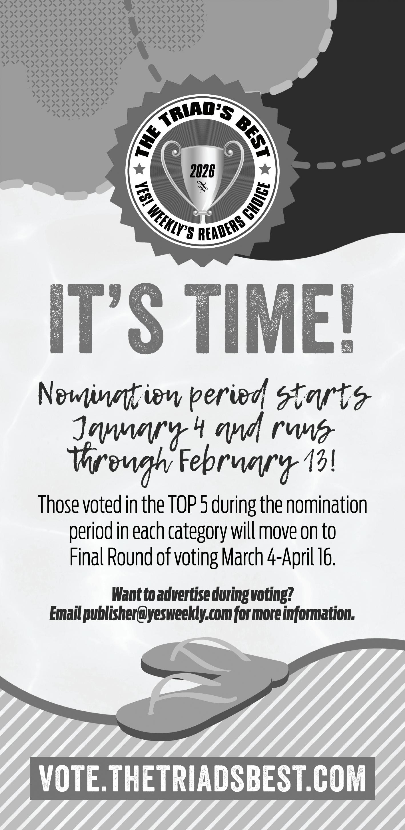 We at YES! Weekly realize that the interest of our readers goes well beyond the boundaries of the Piedmont Triad. Therefore we are dedicated to informing and entertaining with thought-provoking, debate-spurring, in-depth investigative news stories and features of local, national and international scope, and opinion grounded in reason, as well as providing the most comprehensive entertainment and arts coverage in the Triad. YES! Weekly welcomes submissions of all kinds. Efforts will be made to return those with a self-addressed stamped envelope; however YES! Weekly assumes no responsibility for unsolicited submissions. YES! Weekly is